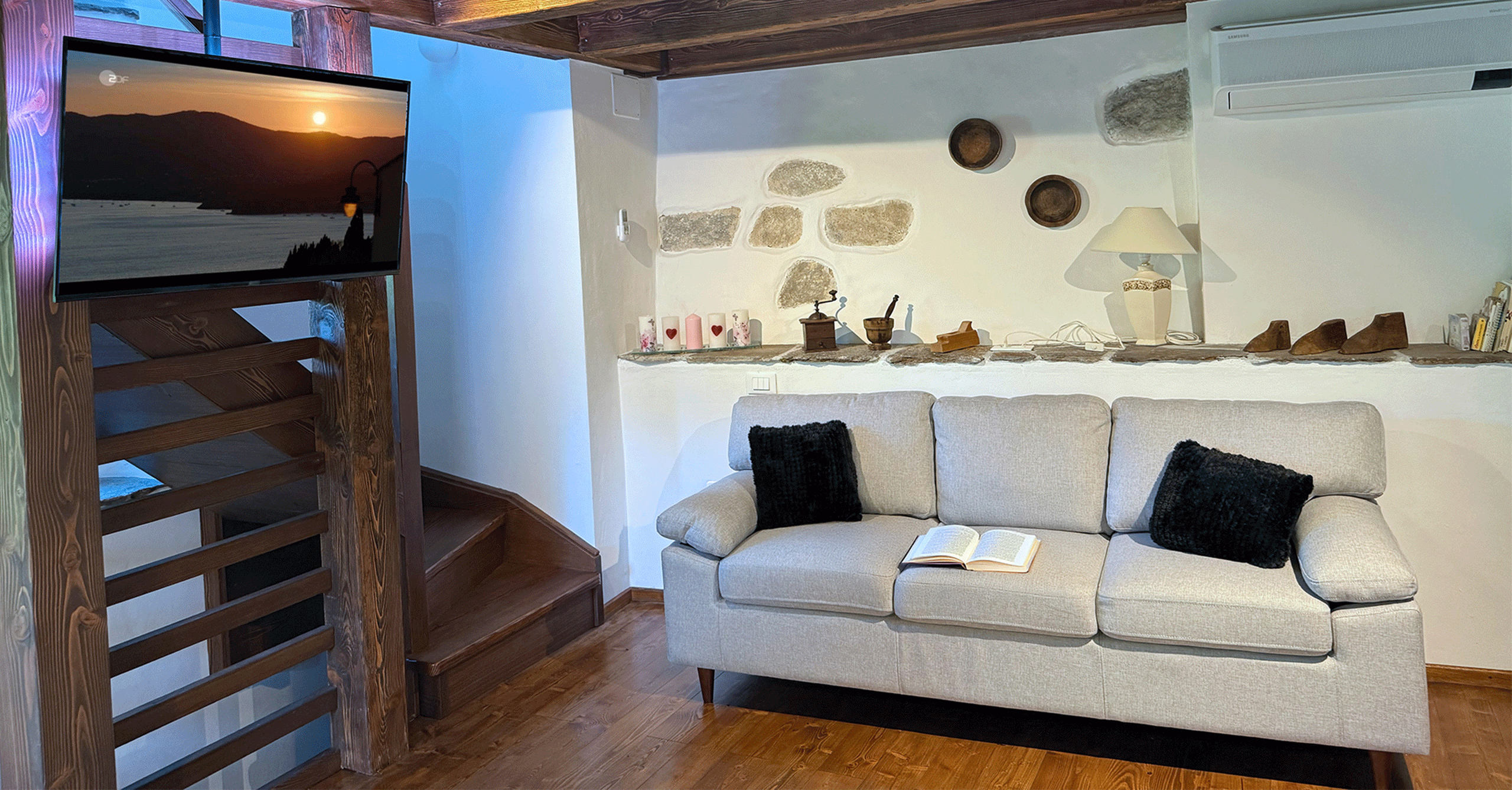 Ein Sofa, TV, Bücher und Spiele sorgen für Gemütlichkeit.
