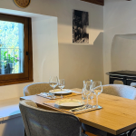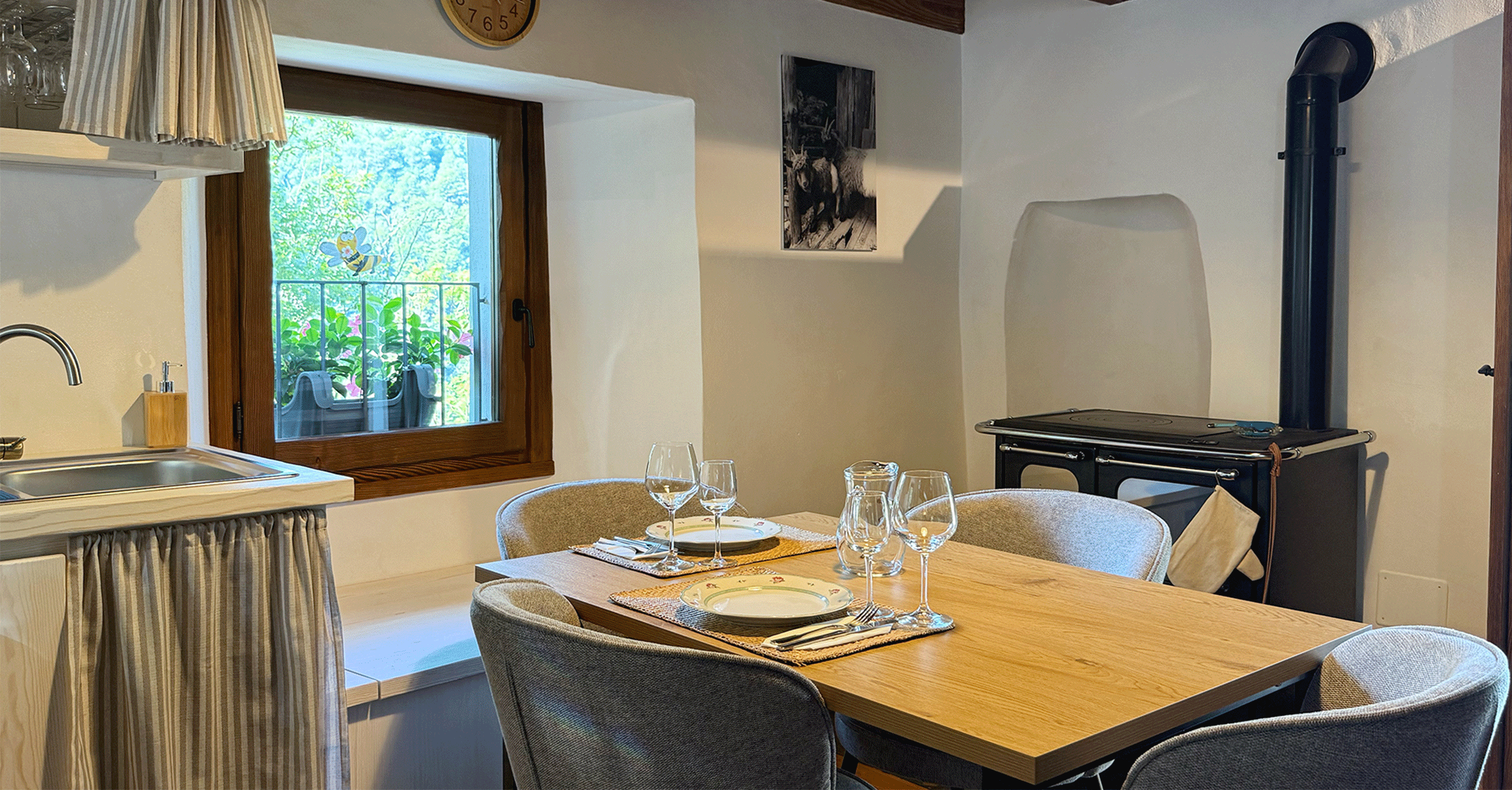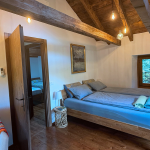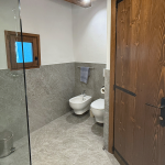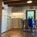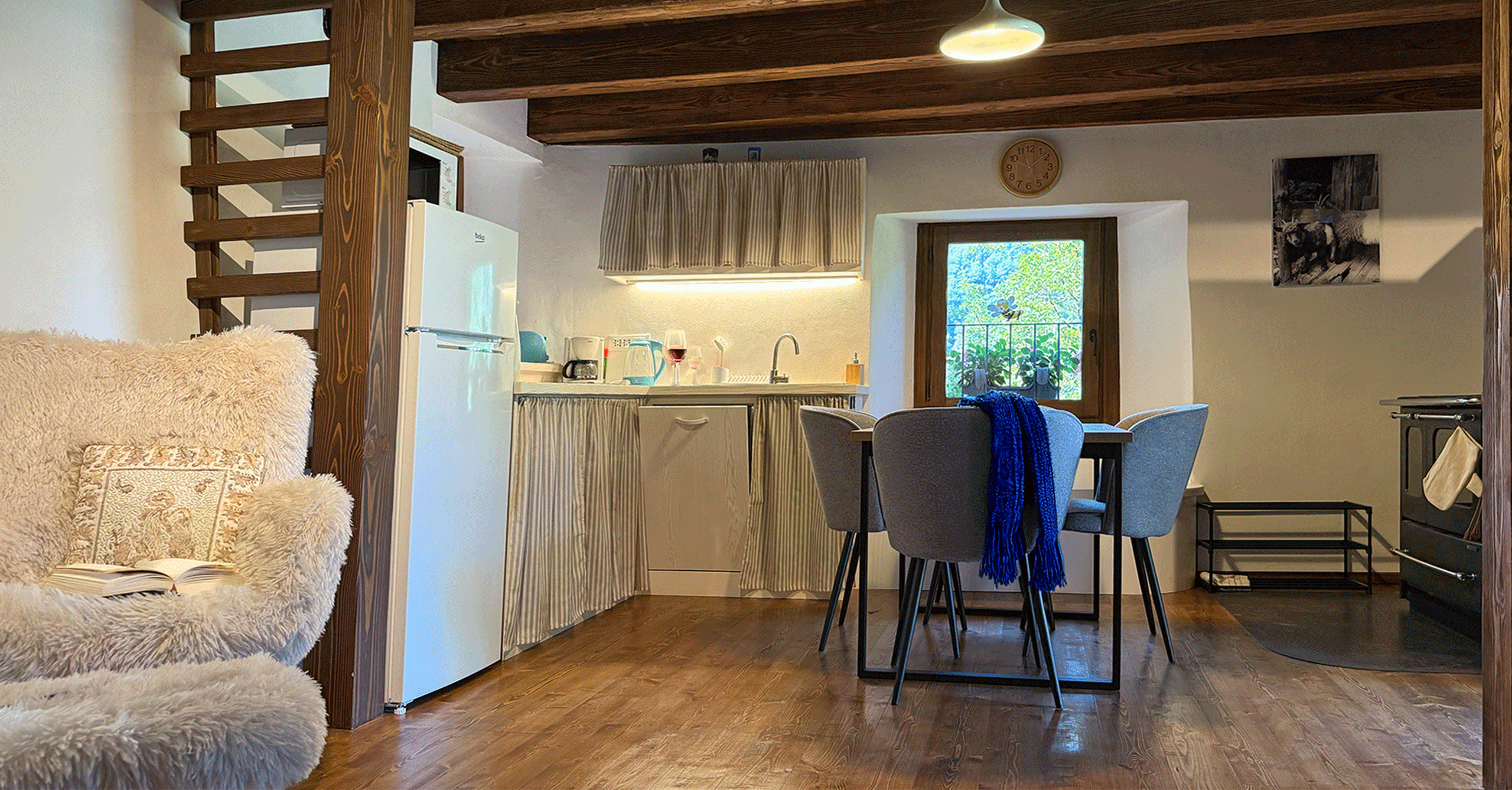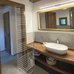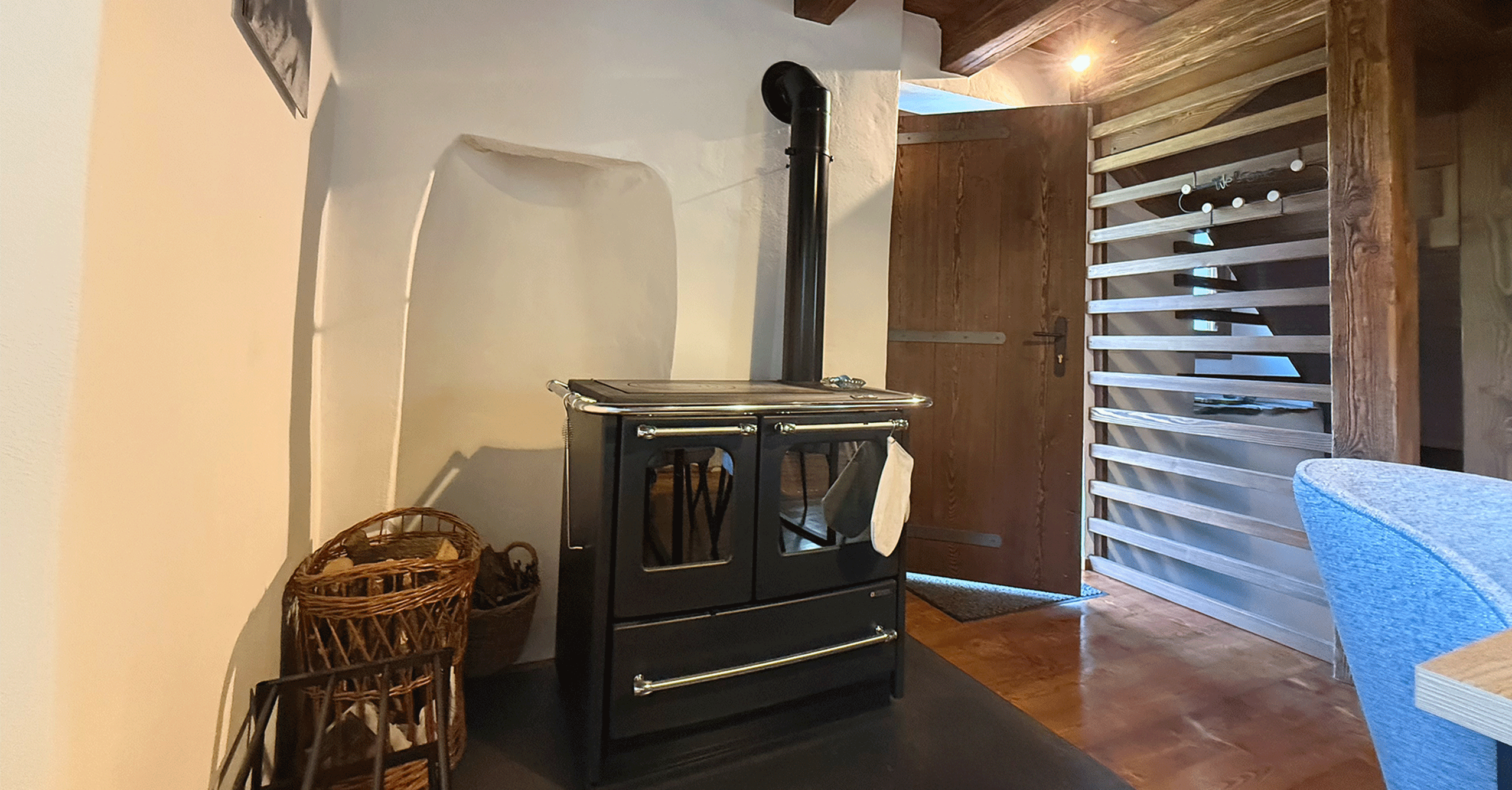 Im Erdgeschoss befindet sich ein großes Bad mit Dusche, im Obergeschoss ein kleineres mit WC. Die Küche ist vollständig ausgestattet mit Holzherd, Backofen, Glaskeramikkochfeld, Geschirrspüler, Mikrowelle, Toaster, Wasserkocher und Kaffeemaschine.