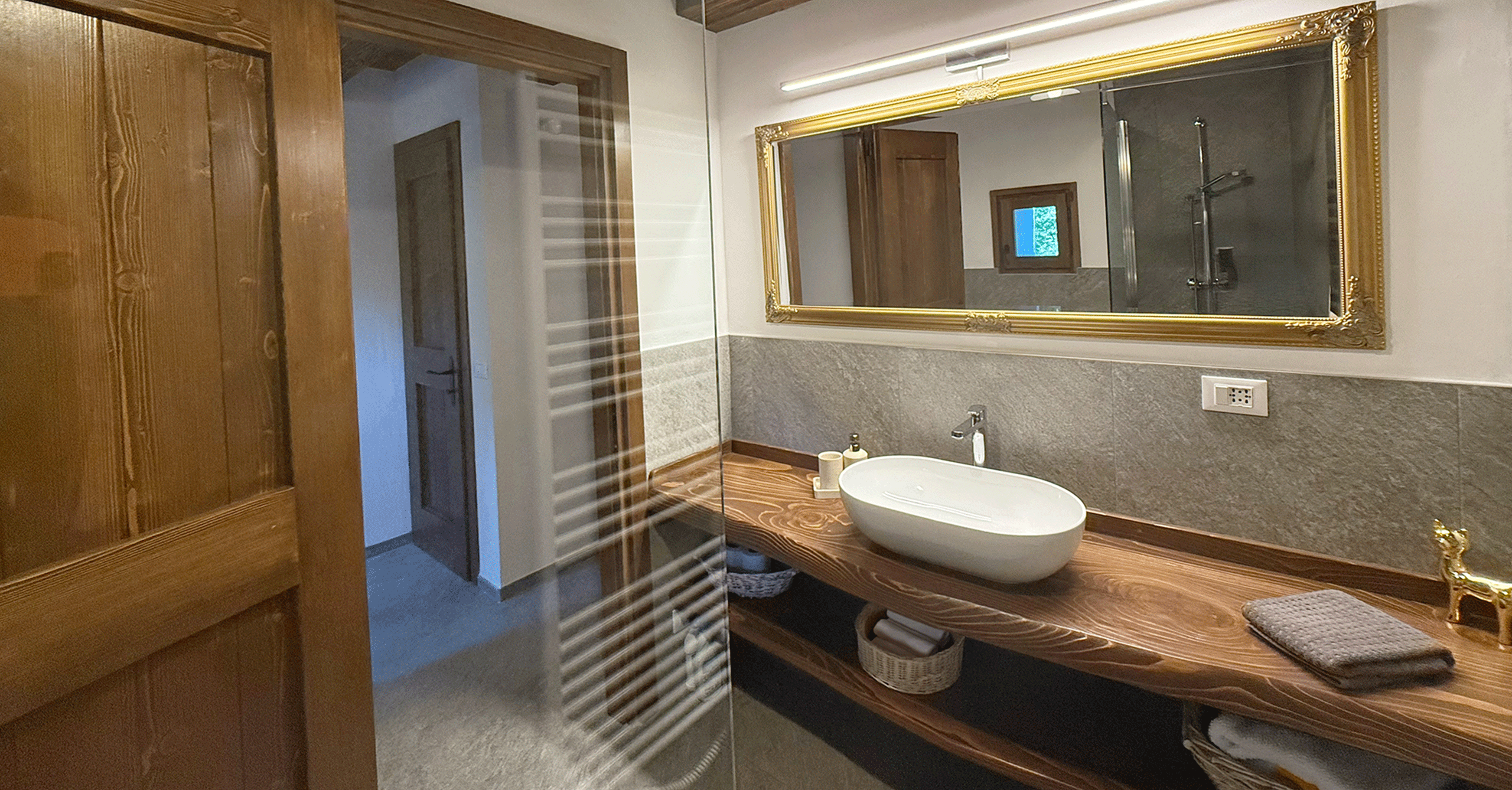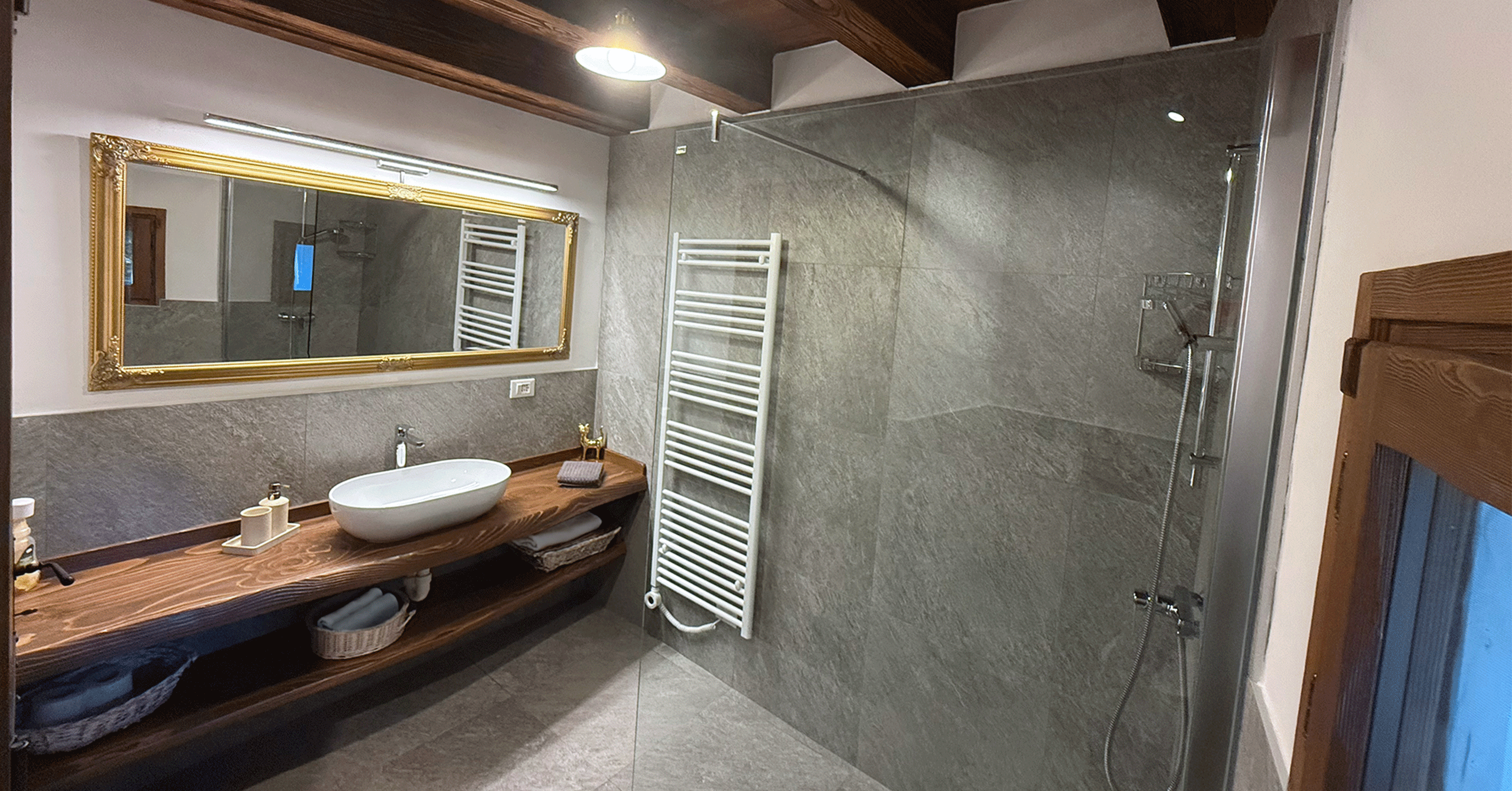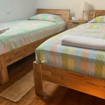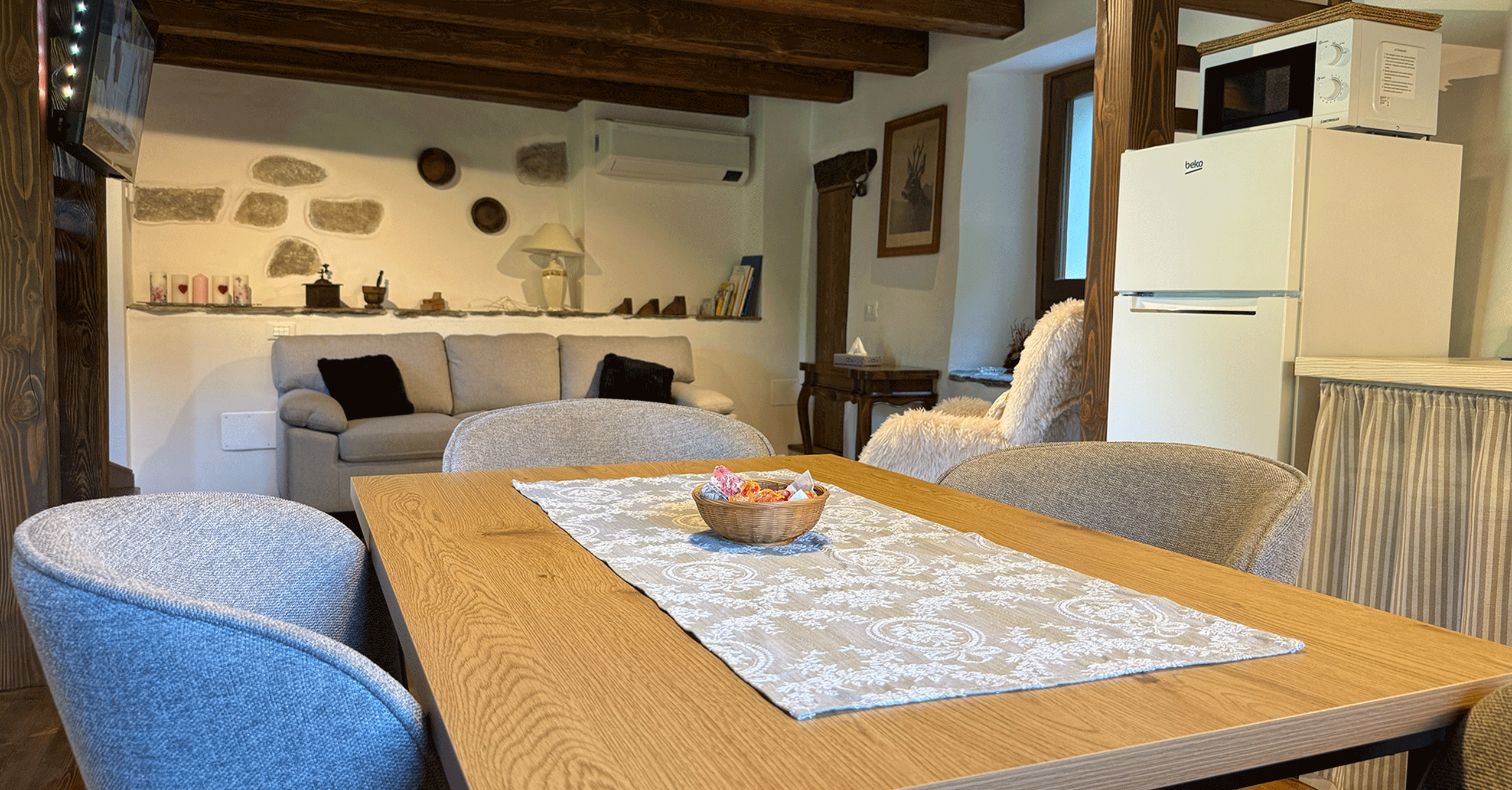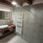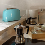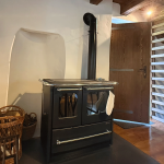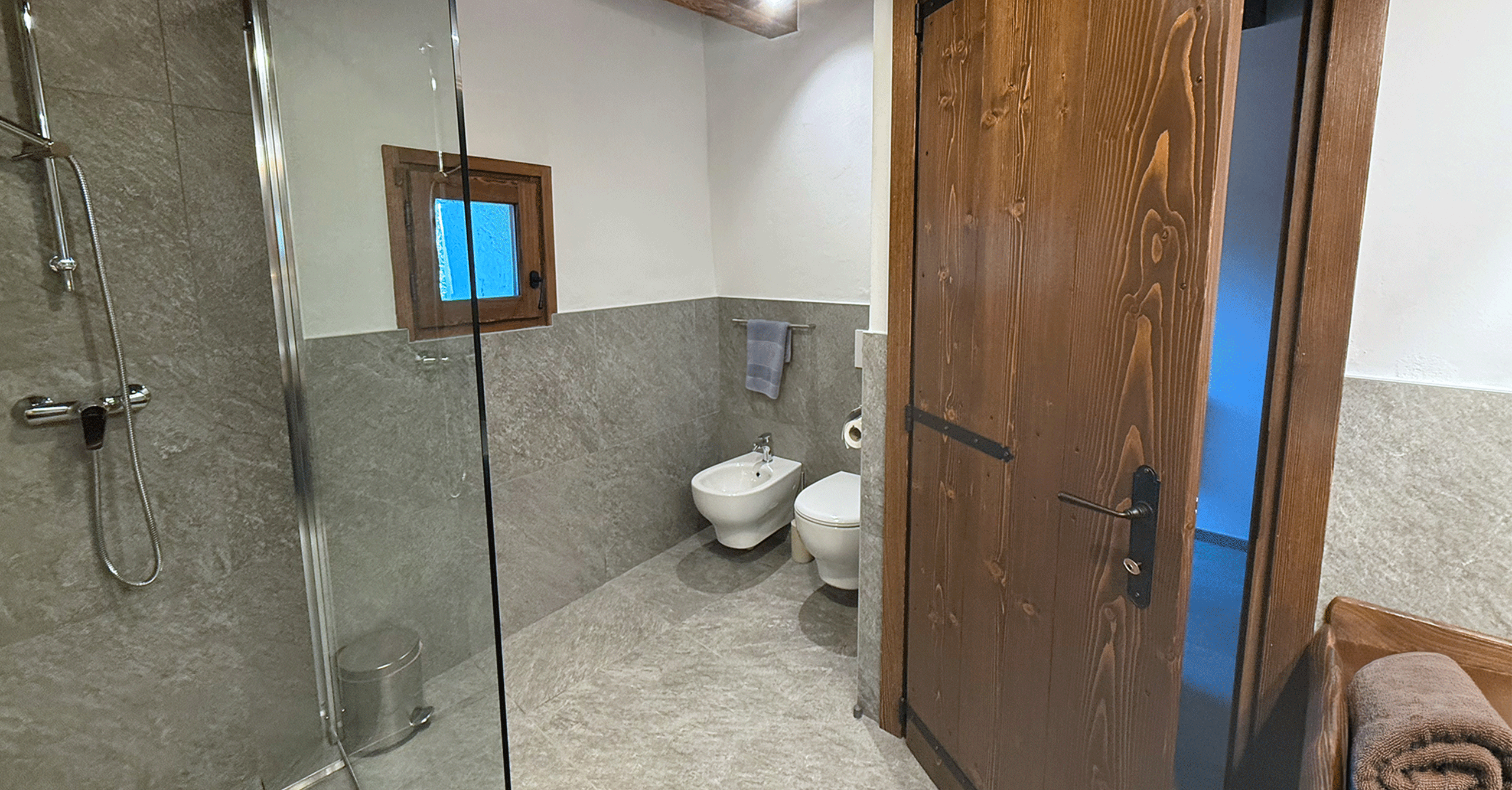 Im Erdgeschoss befindet sich ein großes Bad mit Dusche, im Obergeschoss ein kleineres mit WC. Die Küche ist vollständig ausgestattet mit Holzherd, Backofen, Glaskeramikkochfeld, Geschirrspüler, Mikrowelle, Toaster, Wasserkocher und Kaffeemaschine.